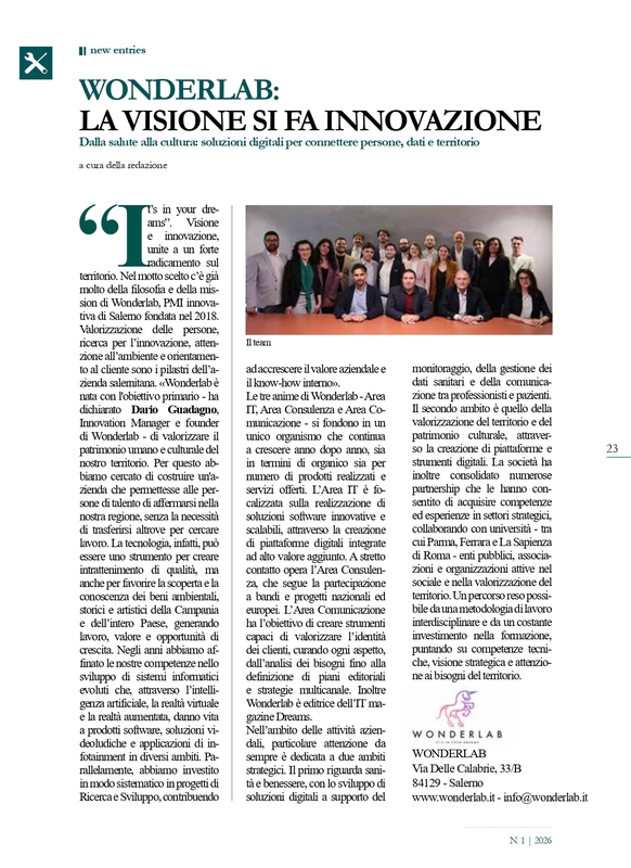 Sulla rivista Costozero, magazine di economia, finanza, politica imprenditoriale e tempo libero edito da Confindustria Salerno è stato pubblicato un articolo che parla proprio di Wonderlab.