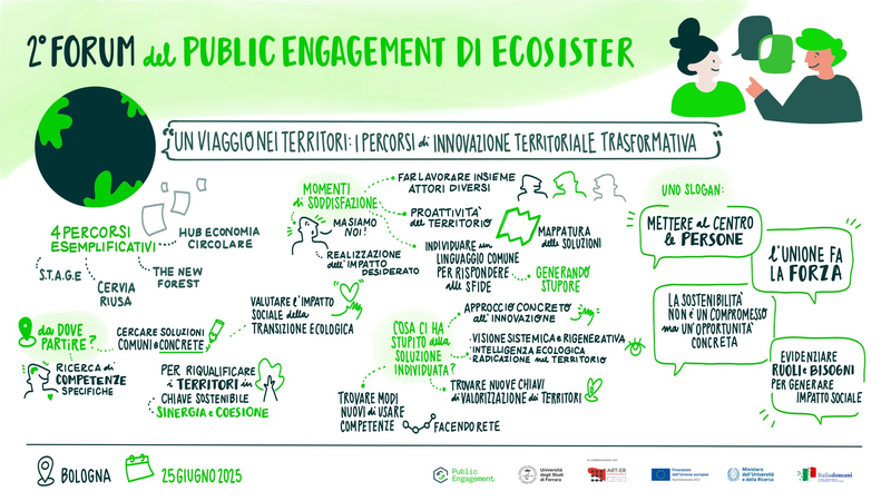 Wonderlab, in qualità di agente territoriale per la sfida "The New Forest", lanciata dal Comune di Bardi e dall’Università di Parma, rappresentata dalla dottoressa Annalaura Ruopolo e dalla dottoressa Morena Pierro, ha partecipato all’edizione 2025 di R2B (Research To Business) presso BolognaFiere, teatro del 2° forum del Public Engagement di Ecosister. A un anno dall’avvio dei Percorsi di Innovazione Territoriale Trasformativa, l’evento ha rappresentato l’occasione per fare il punto su quanto fatto e per riflettere e confrontarsi sul metodo e sull’interazione tra ricerca e territori, tramite gruppi di discussione, interviste e momenti di dialogo interattivo e networking e la presenza di ospiti di alto livello per stimolare la riflessione sul ruolo della terza missione e sulla relazione tra innovazione e società. Tra i momenti maggiormente interessanti quello relativo con le interviste a più voci con gli attori dei percorsi territoriali. Sono saliti sul palco la dottoressa Sabrina Mascia per la sfida Cervia Riusa (oggetti e relazioni) non si getta via nulla (né beni né persone); la dottoressa Isabella Rancan per S.T.A.G.E.: Sfida Trasformativa per l'Acquacoltura di Goro in Evoluzione; la dottoressa Annalaura Ruopolo, project manager di Wonderlab, per la sfida The New Forest, Network per la Valorizzazione del Patrimonio Boschivo dell’Appennino Parmense Piacentino e la dottoressa Rita Piccinini per la sfida HUB economia circolare inclusiva: dalla transizione ecologica alla transizione sociale.